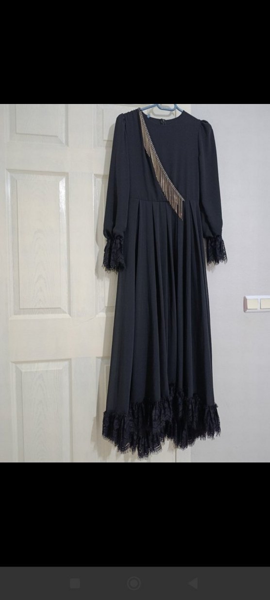Uzun siyah elbise, bol kesim, kayık yaka ve ince askılı kollarla. Nakışlı desenler ve püskül detaylarıyla gotik tarzda düğün için uygun.