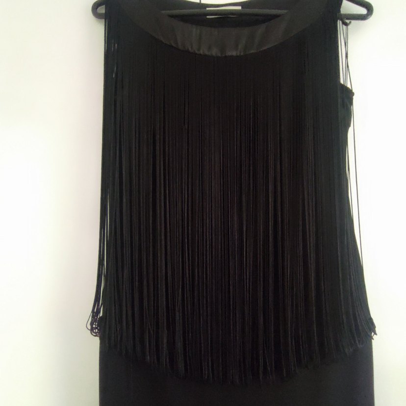 Siyah, kisa ve vücuda oturan abiye elbise, tekne yaka ve askılı kollara sahip. Püsküllerle süslenmiş gotik ve modern tarzda, parti için uygun.