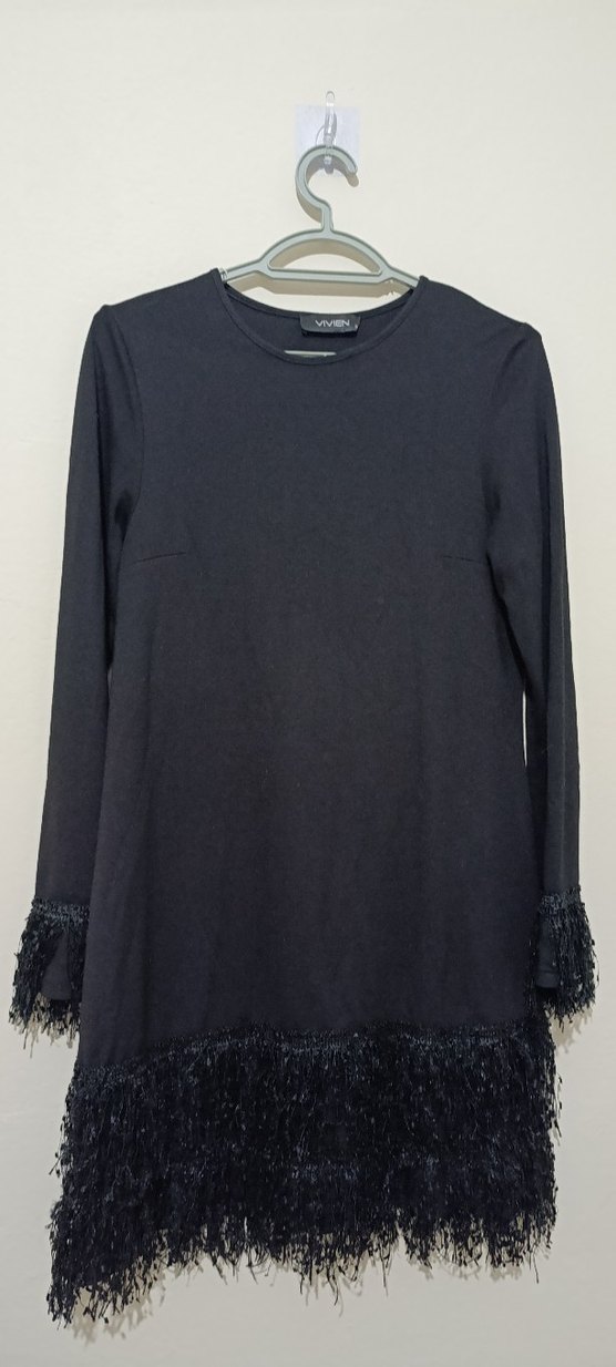 Siyah renkli, uzun kollu ve yuvarlak yakalı midi tunik. Püskül detayları kol ve etek ucunda, bol kesimli.