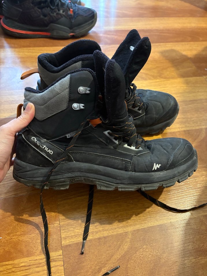Lastik malzemeden yapılmış, cırt cırtlı siyah Quechua erkek outdoor botları. Spor için uygun, normcore ve rock punk tarzını yansıtıyor. Kullanıldı göründüğü gibi