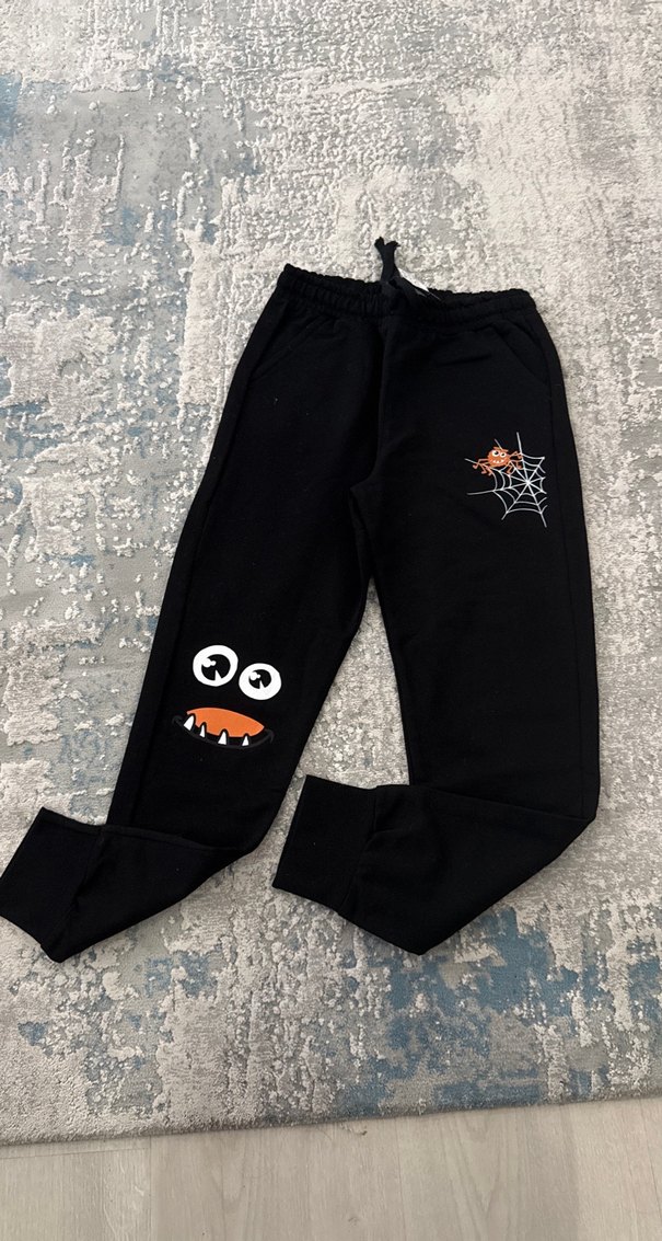 Siyah, örümcek ve ağ detaylı, velcro bel bantlı, yumuşak kumaştan yapılmış eşofman altı, sıfırdır, kalın değil mevsimliktir,