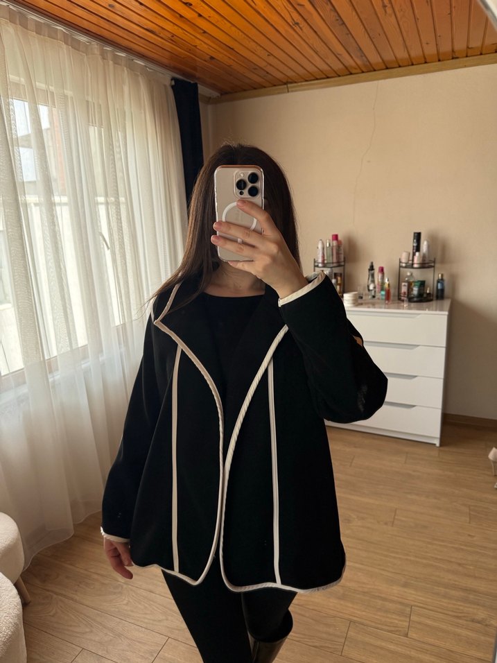 Siyah renkli, uzun kollu ve yuvarlak yakalı hamile ceketi, rahat kesimi ve midi boyu ile günlük kullanıma uygundur. Kontrast detayları ve yumuşak dokusuyla şık ve rahat bir görünüm sunar.