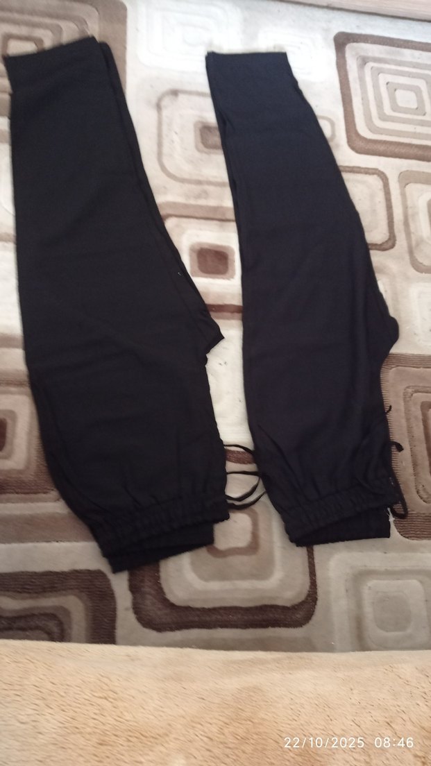 Sentetik kumaştan, lastikli bel siyah, bol kesim kadın kumaş pantolon. Günlük dış mekan kullanımı için uygundur.
