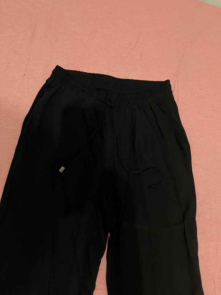 Siyah, rahat kesim ve midi boy kadın pantolon, ipeksi dokusuyla konfor sağlar. Sokak stiline uygun, şık ve rahat bir seçimdir.