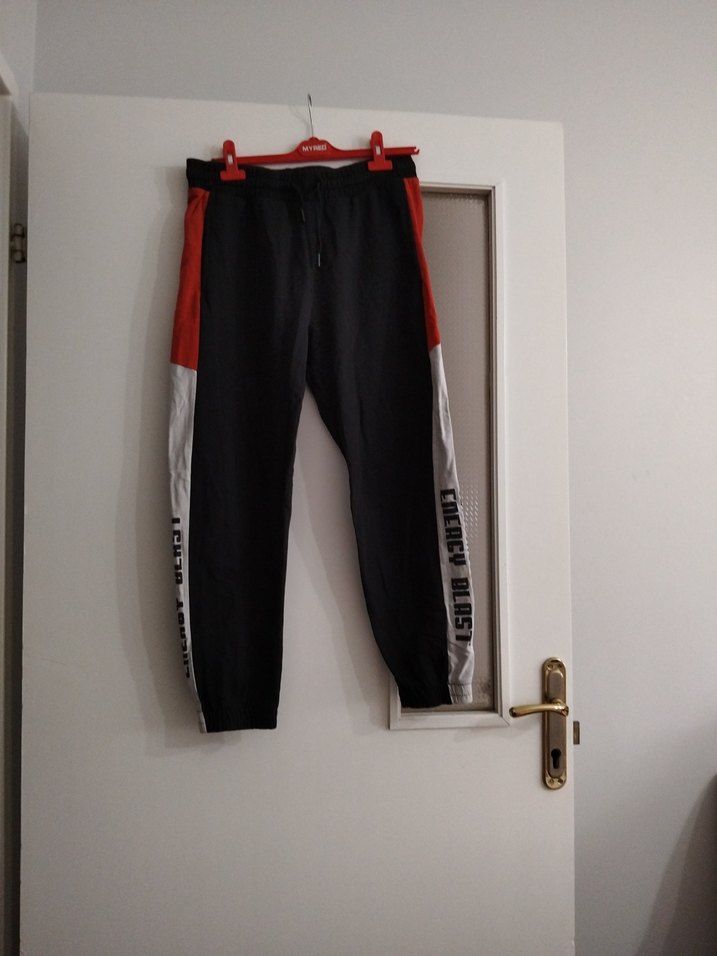 Siyah, rahat kesim erkek eşofman altı, kemerli ve yumuşak kumaşlıdır. Kırmızı ve beyaz yan panellerle sokak stili sunar. Kenarımda küçük deforması var.
