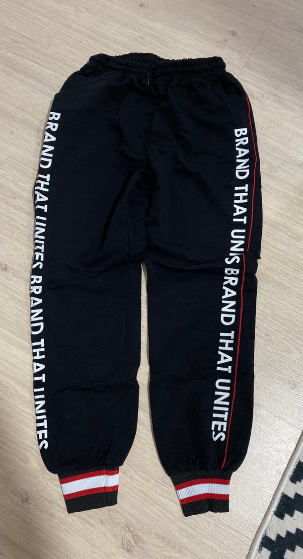 Siyah renkli, rahat kesim erkek eşofman altı, elastik bel ve paçalarla. Yanlarda ve paçalarda kırmızı-beyaz çizgiler ve 'BRAND THAT UNITES' yazısı bulunur. Günlük kullanım için uygundur.