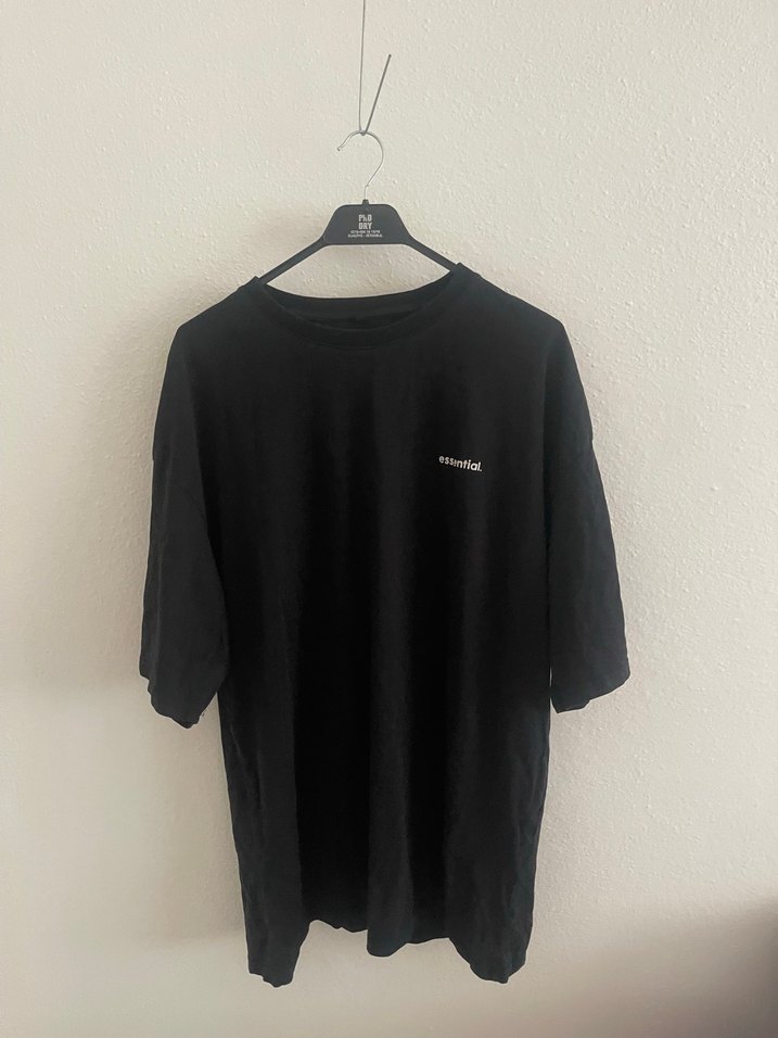 Siyah keten kumaştan, yuvarlak yakalı, rahat kesim kısa kollu erkek tişörtü. Minimalist sokak stili için küçük baskılı logo içerir. Günlük kullanım için uygundur.