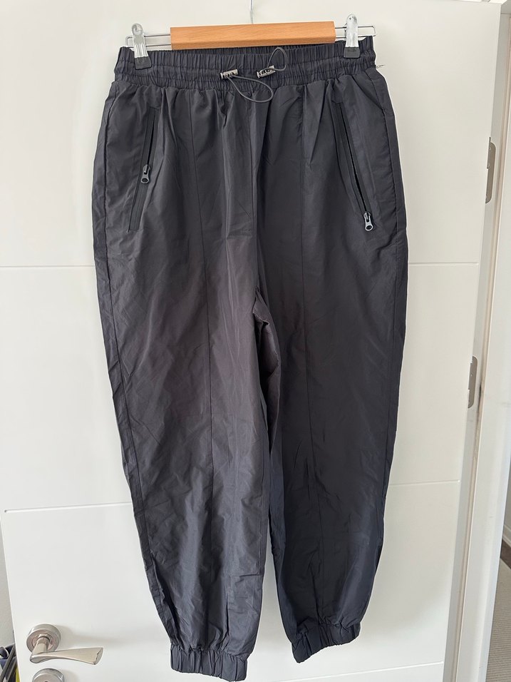 Siyah fermuarlı cepleri ve lastikli beli olan, rahat kesim sentetik kumaştan yapılmış günlük dış mekan pantolonu. Bel basen ve boy ölçülerine görsellerde yer vermilmiştir.