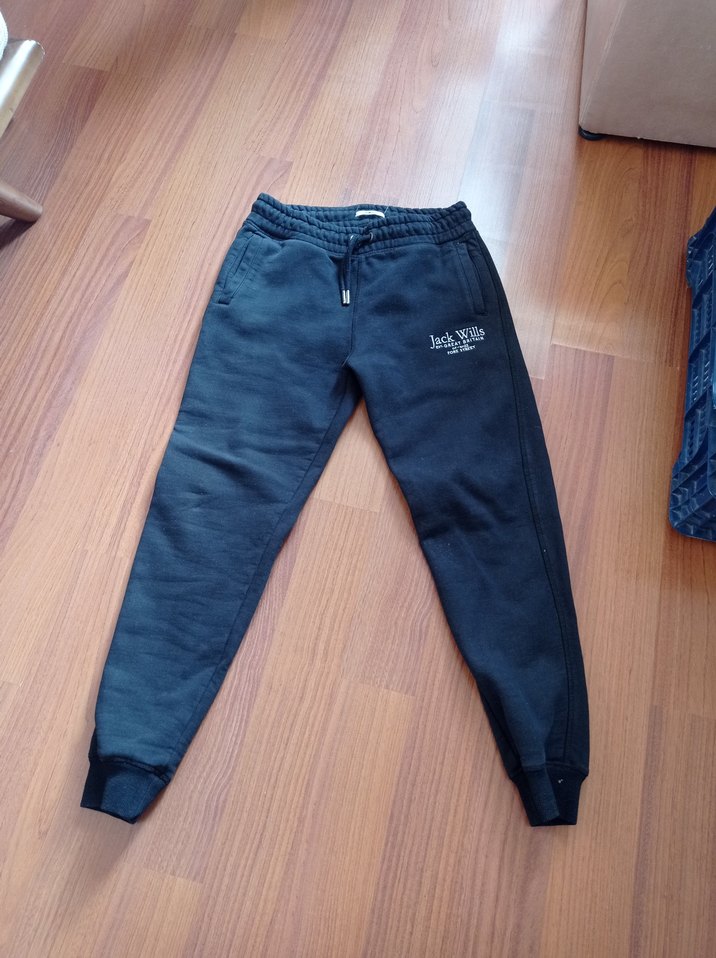 Beli bağcıklı, manşetli paçalı siyah eşofman altı, hafif logo detaylı. Spor ve rahat kombinler için uygun.