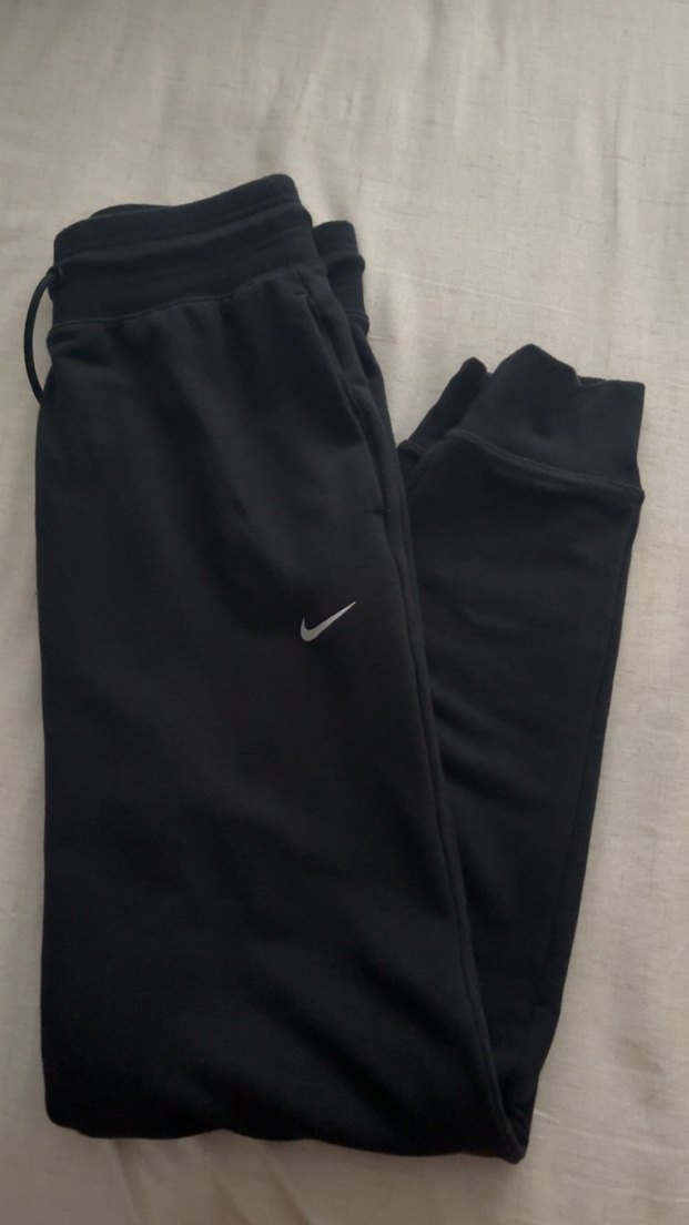 Siyah, yumuşak ve sıcak dokulu, rahat kesim kadın eşofman altı. İnce logo detaylı, günlük ve sokak stiline uygun.