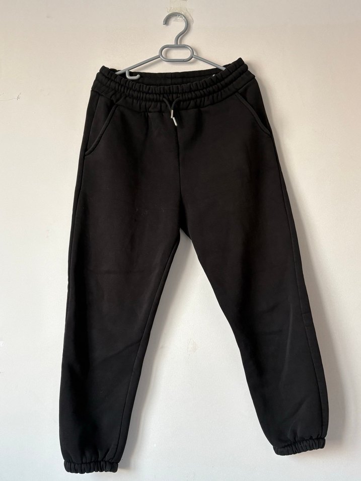 Siyah, yumuşak ve sıcak kumaştan, elastik bel ve paça detaylı, rahat kesim kadın eşofman altı.