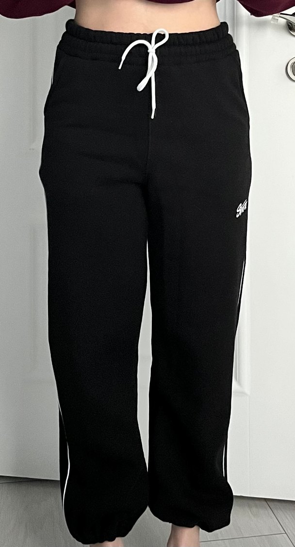 Siyah, rahat kesim kadın eşofman altı. Normal midi boy, beyaz bağcıklı. Spor ve günlük kullanıma uygun yumuşak, sıcak kumaştan yapılmıştır. hem bol paça hemde dar paça kullanıma uygun lastikleriyle istediğiniz şekli verebilirsiniz marka temsilidir