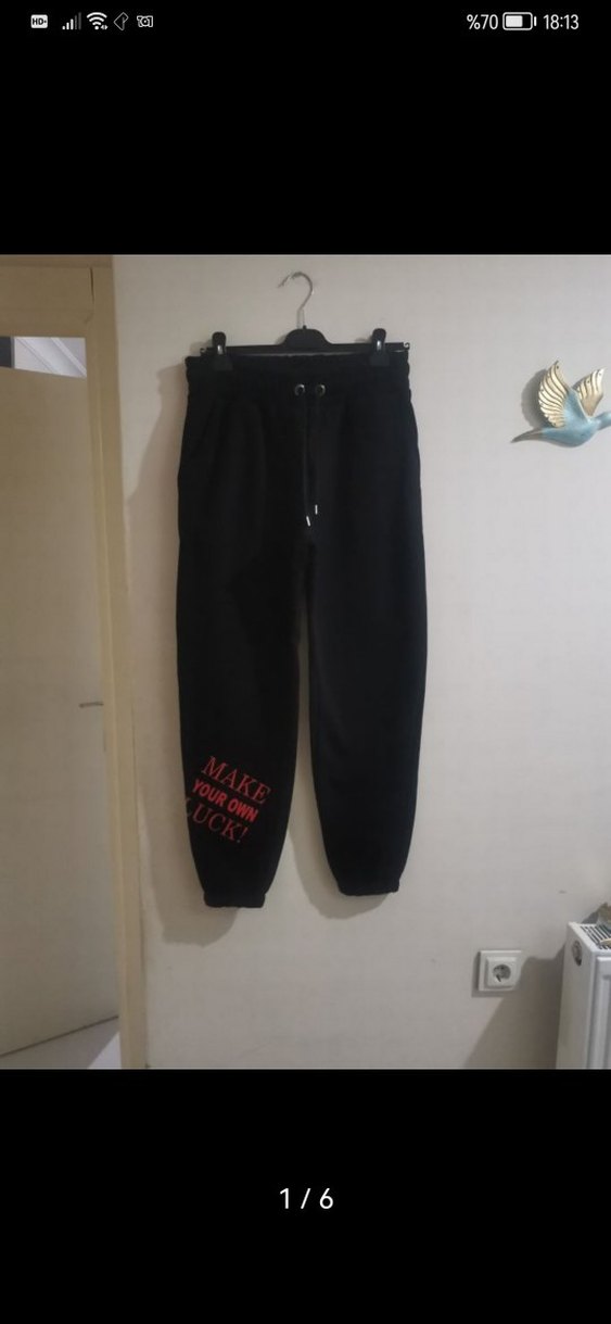 siyah, rahat kesim, yumuşak kumaştan kadın eşofman altı. Kırmızı 'MAKE YOUR OWN LUCK!' yazısı bulunur. Dış mekan için uygun.
