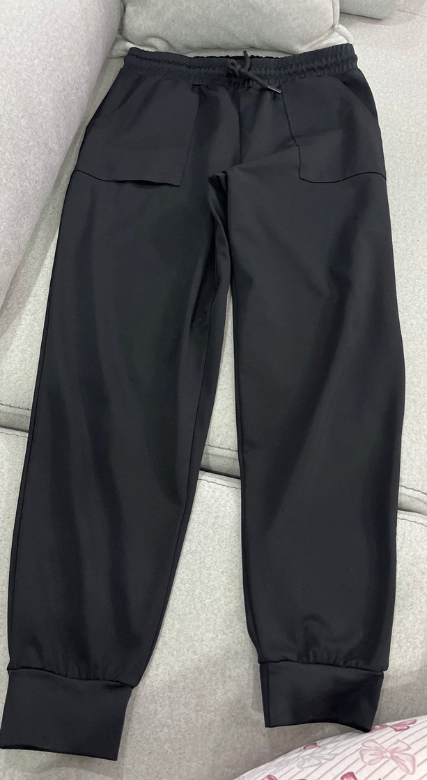 Siyah, rahat kesim ve midi boyda, düz desenli sentetik kumaştan yapılmış kadın eşofman altı. Günlük kullanıma uygun, zahmetsiz şıklık sunar.
