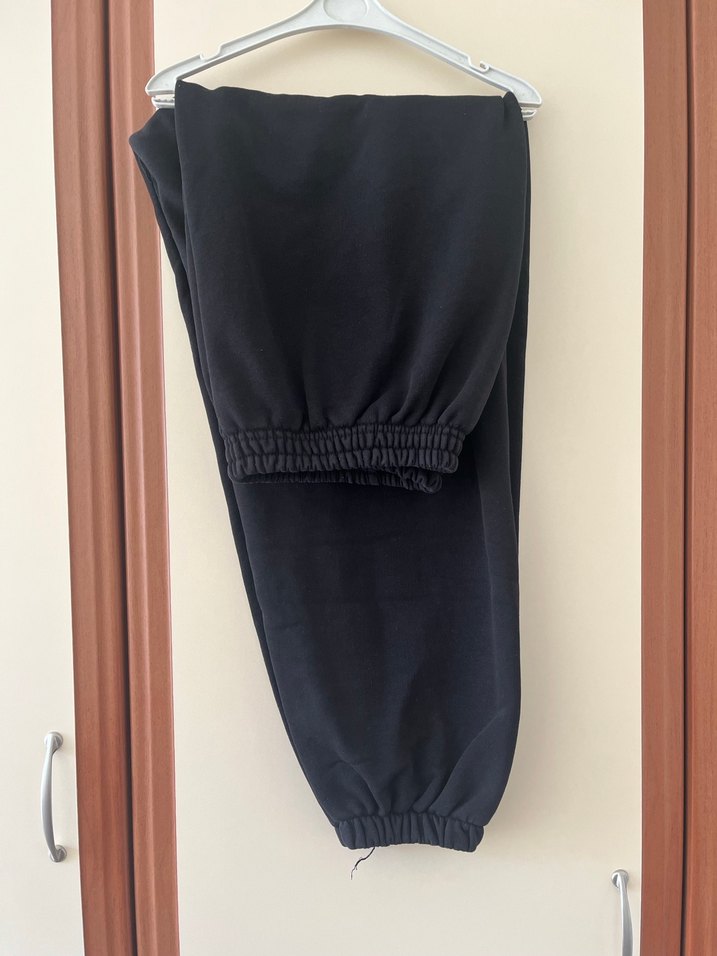 Siyah, yumuşak sentetik kumaştan, rahat kesim ve lastikli bilek detayına sahip kadın eşofman altı. Günlük kullanıma uygun, trend bir rahatlık sunar.