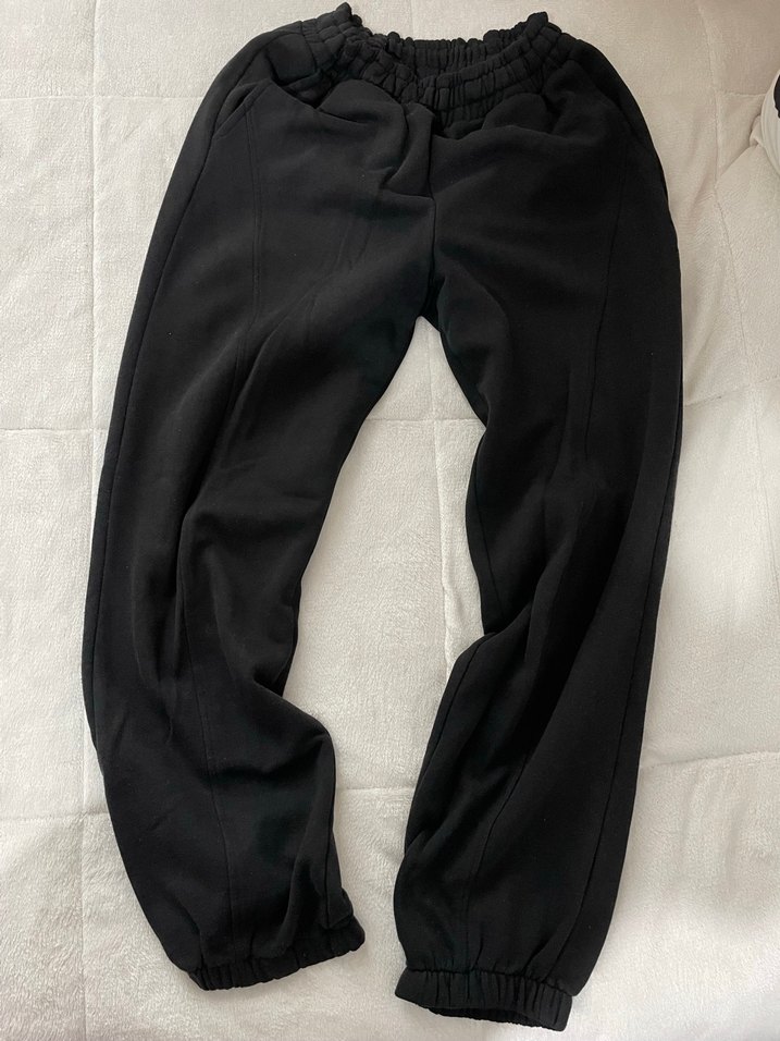 Yumuşak, sıcak kumaştan yapılmış, elastik bel ve bilek detaylı siyah rahat kesim eşofman altı, günlük kullanım için uygundur.