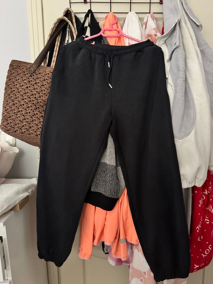 Yumuşak ve sıcak kumaştan, rahat kesim siyah kadın eşofman altı. Günlük sokak tarzı için uygun midi boy.