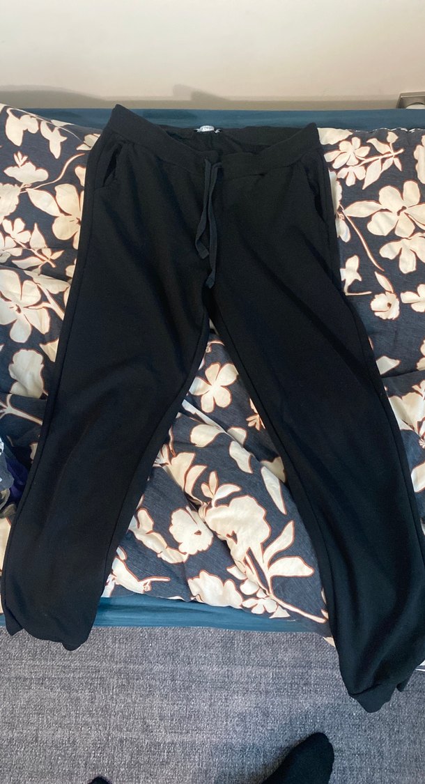 Yumuşak sentetik kumaştan, bağcıklı bel detaylı siyah rahat kesim kadın eşofman altı, dış mekan için şık ve rahat.