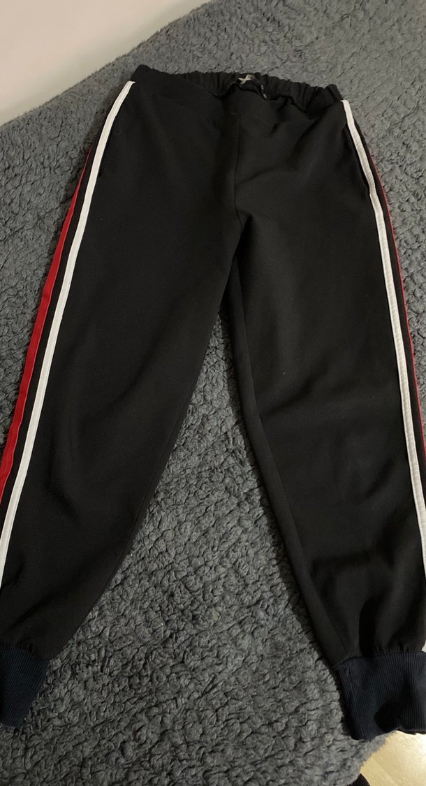 Siyah, rahat kesim kadın eşofman altı, elastik bel ve yanlarda sportif şeritlere sahiptir. Rahat sentetik kumaştan üretilmiştir.