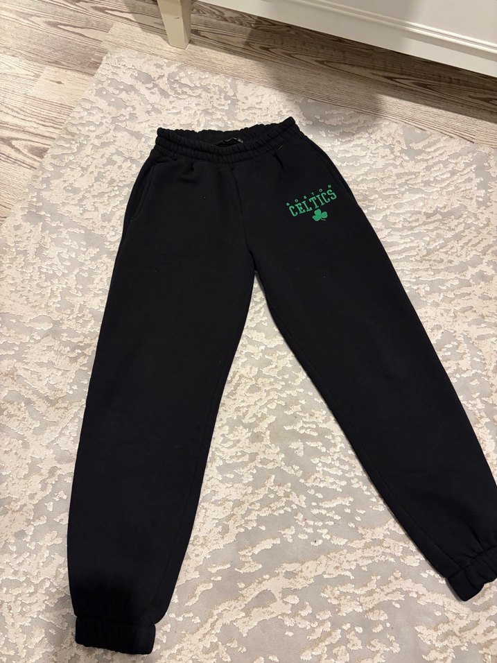Yumuşak kumaştan, rahat kesim siyah kadın eşofman altı, küçük yeşil Celtics logosu ile. Rahat ve şık dış mekan kullanımı için uygun. pamuklu sayılı kez giyildi