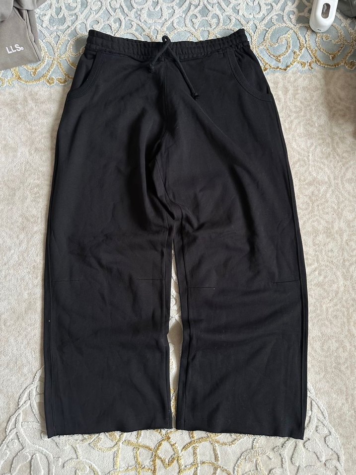 Siyah, bol kesim, belden bağlamalı ve yan cepli, yumuşak ve sıcak kumaştan kadın eşofman altı.