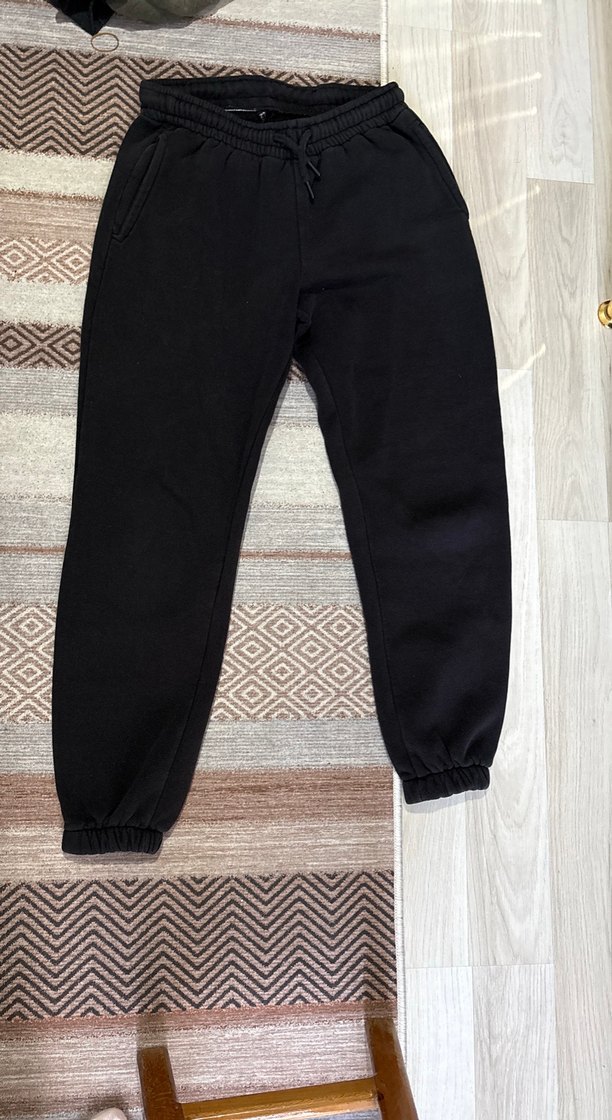 Siyah, rahat kesim ve normal boyda, yumuşak sentetik kumaştan kadın eşofman altı. Lastikli bilek ve bağcıklı bel ile günlük kullanıma uygun, zahmetsiz şıklık sunar.