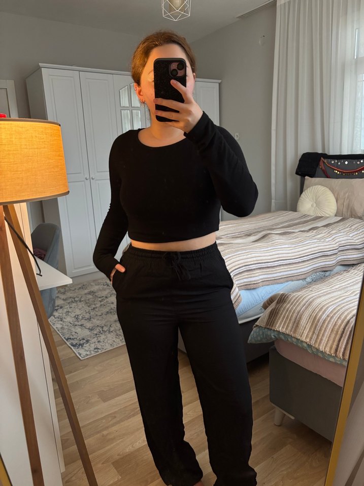 Kadınlar için siyah, rahat kesim, uzun kollu ve yuvarlak yaka eşofman takımı. Yumuşak ve sıcak kumaştan, midi boyda ve desensiz, günlük kullanım için uygun. Sadece 1 kere giyildi