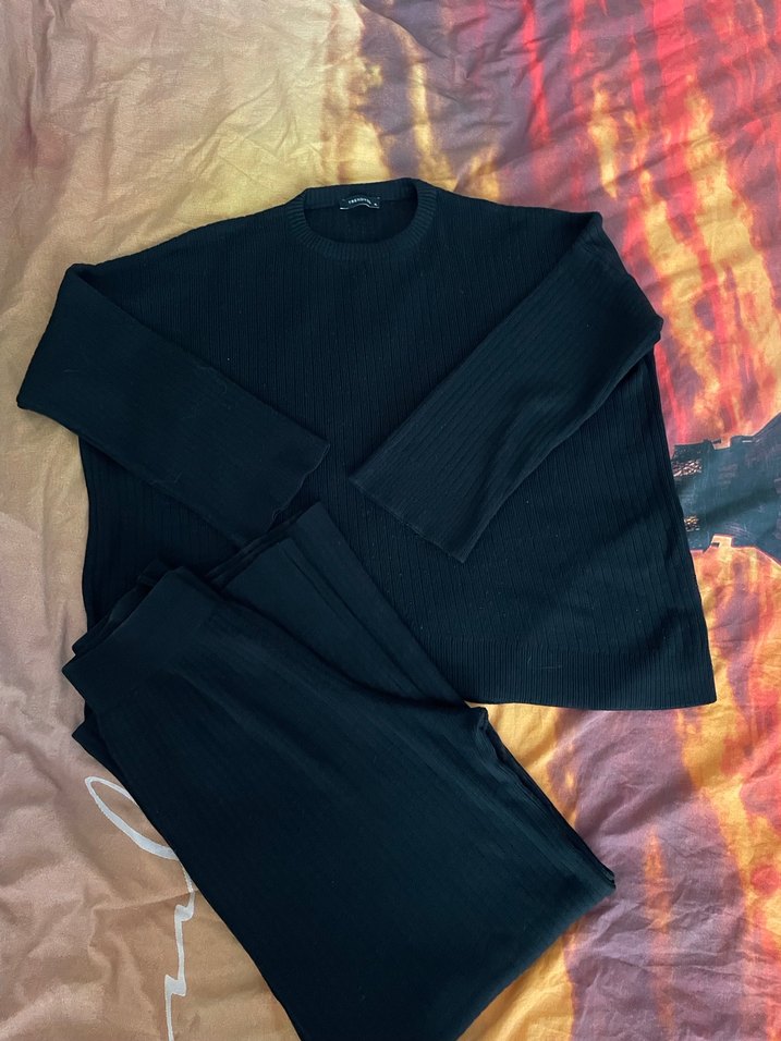 Siyah renk, bol kesim ve uzun kollu, yuvarlak yaka kadın eşofman takımı. Yumuşak sentetik kumaştan üretilmiş, günlük kullanıma uygun rahat bir model.