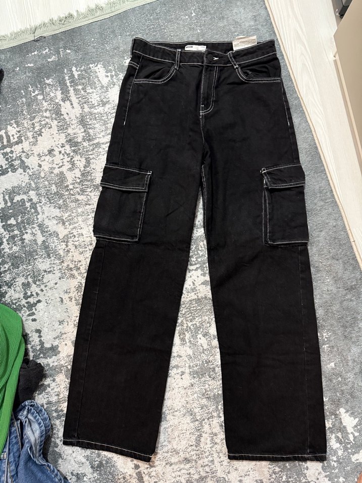 Siyah denim kumaştan, bol kesim kadın jean. Normal midi boyda, günlük kullanıma uygun cepli tasarım.