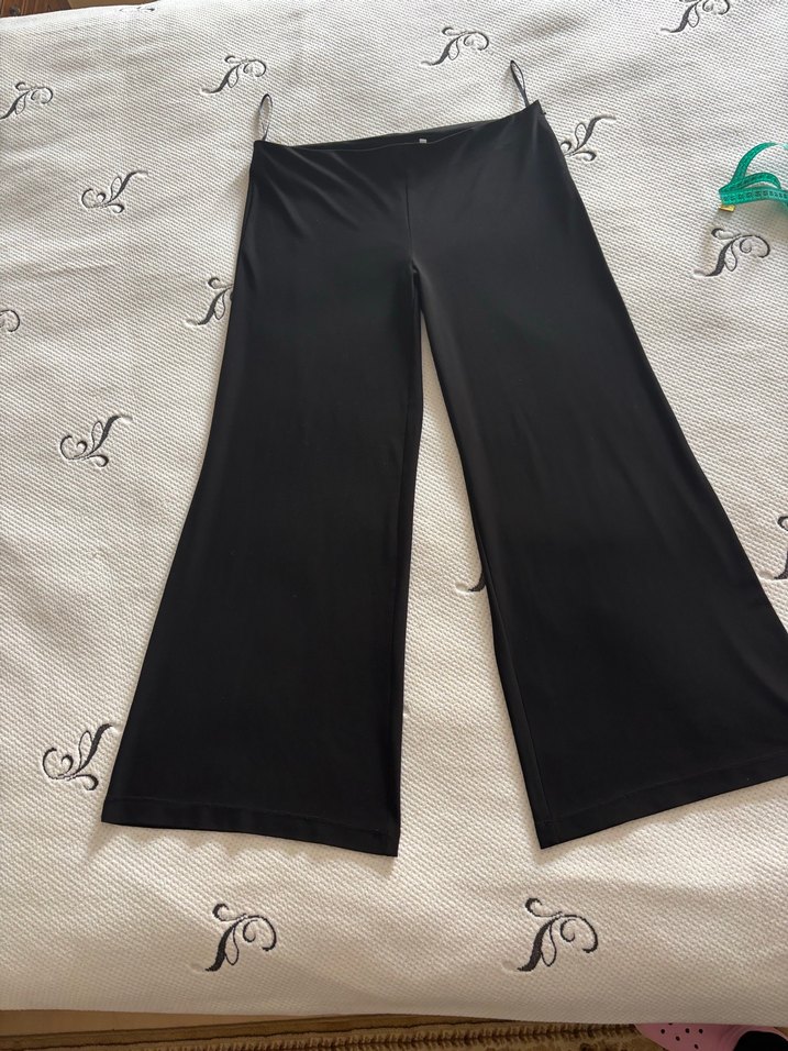 Siyah, bol kesim kadın pantolonları uzun boyda ve elastik bel bantlıdır, yumuşak sentetik kumaştan günlük kullanım için uygundur. Ebru dan alındı ama hamile pantolonu değil normal koleksiyondan. Esnek Hafif tril bir kumaş . Bedende 44 yazıyor ama 42 ye daha rahat olur 1-2 defa giyildi boy 92