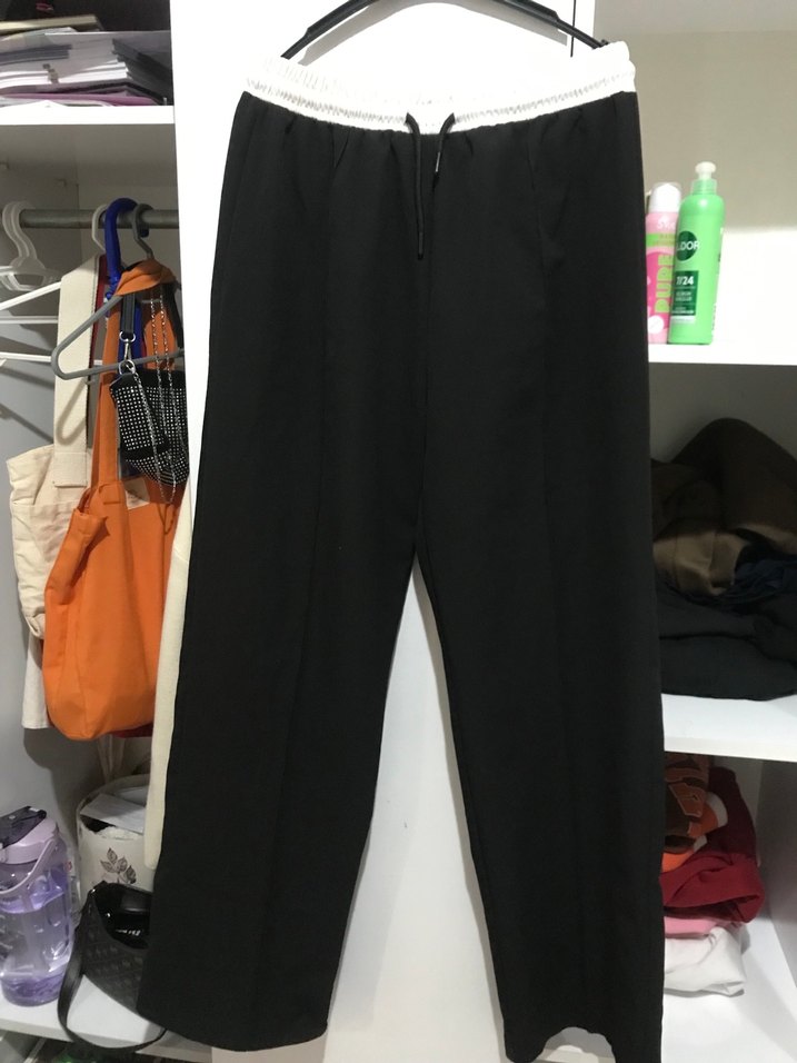 Yumuşak ve sıcak dokulu, beyaz lastik ve bağcıklı siyah rahat kesim kadın kumaş pantolon. Günlük sokak stili için uygun. 44 beden salaş sevenler için 40 bedenlerde cok rahat olur