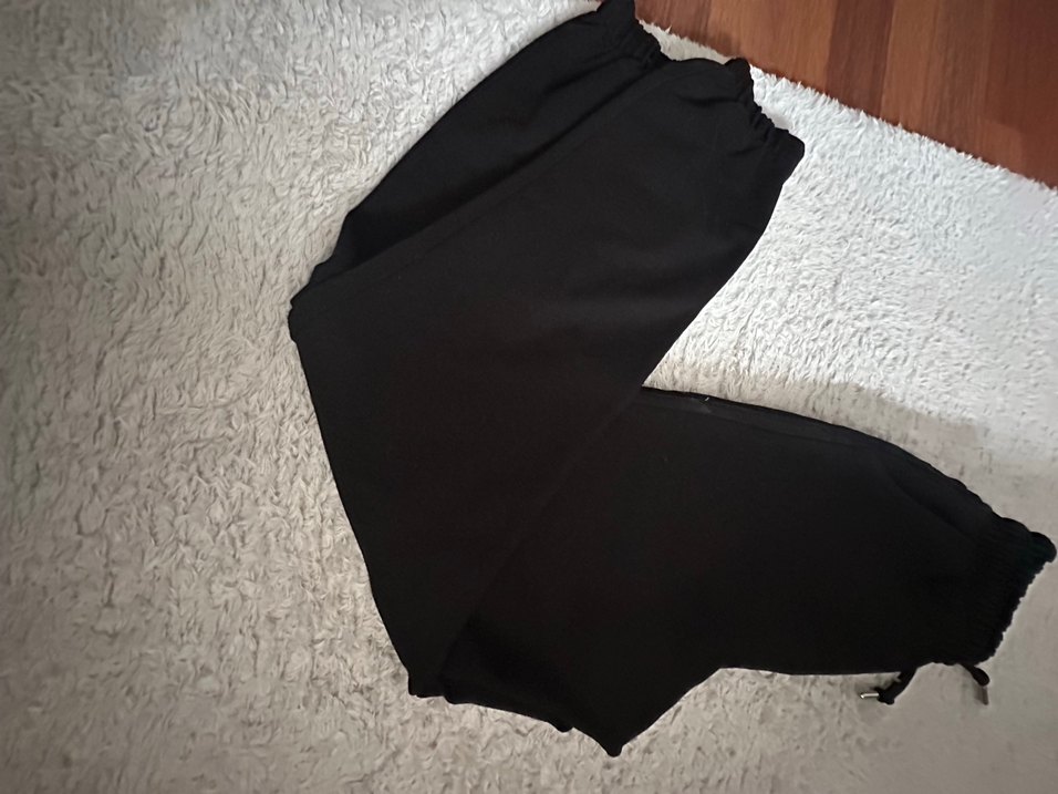 Siyah kumaştan, rahat kesim ve dökümlü tasarıma sahip kadın pantolonu. Yumuşak sentetik kumaştan yapılmış, günlük kullanım için uygundur.