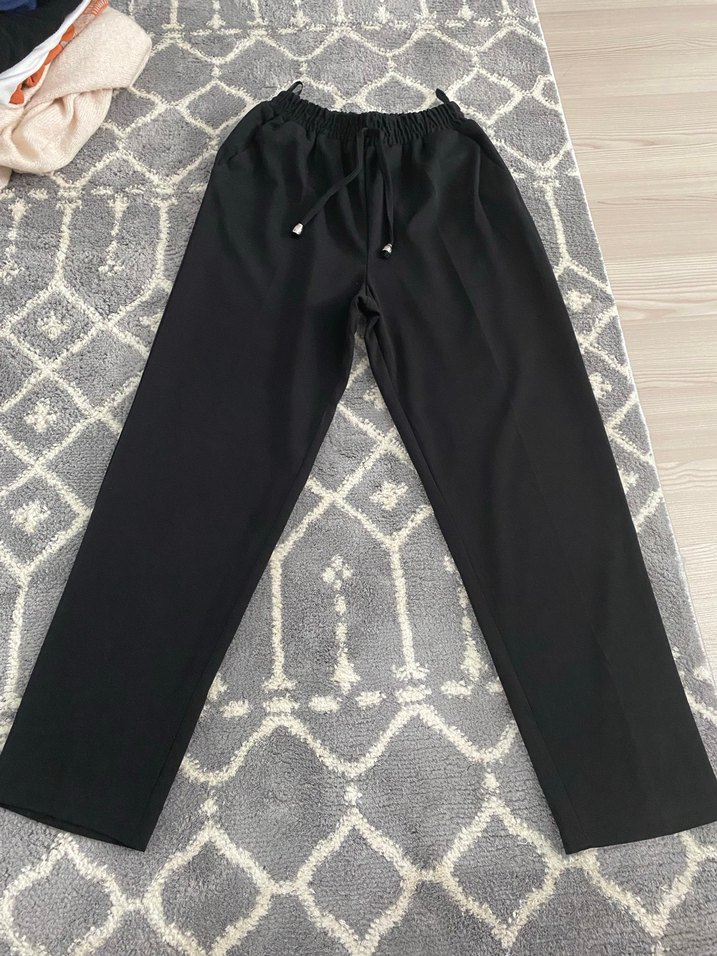 Siyah renk, rahat kesim ve midi boyda kadın kumaş pantolon. Pürüzsüz sentetik kumaştan üretilmiş, günlük kullanıma uygun şık ve rahat bir model.