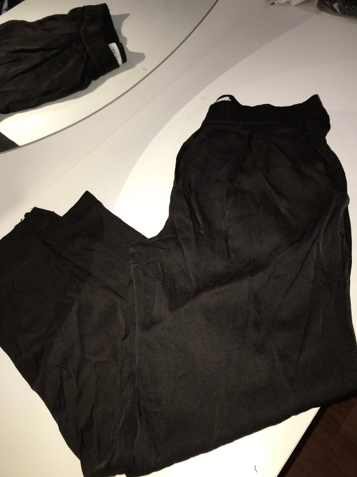 Kadınlar için siyah, rahat kesim ve midi boy kumaş pantolon. Yumuşak ve parlak kumaştan üretilmiş, dış mekanlarda şık ve rahat kullanım sağlar.