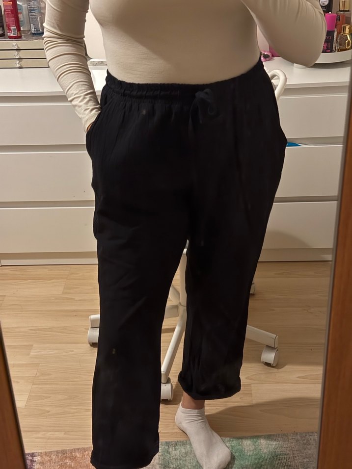 Siyah, rahat kesim ve midi boy kadın pantolon. Yumuşak ve sıcak kumaştan üretilmiştir. Günlük rahat kullanıma uygundur.