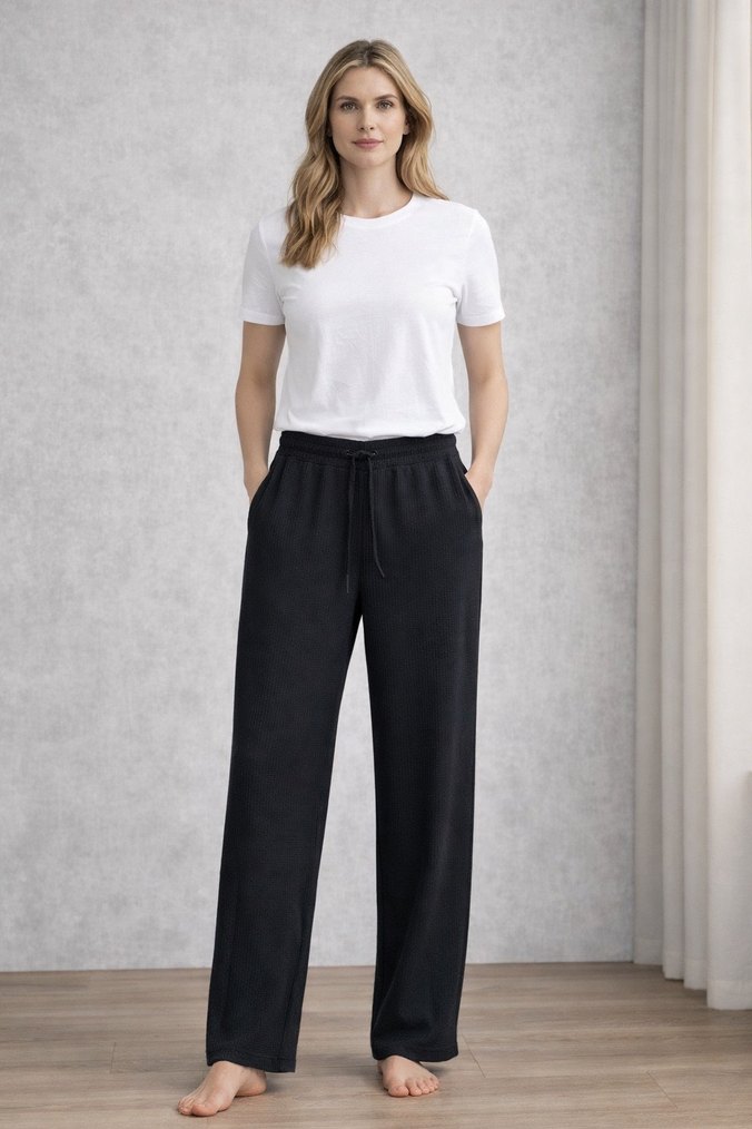 Yumuşak ve sıcak kumaştan, midi boy, rahat kesim siyah kadın pantolon. Günlük rahat kullanıma uygun, zahmetsiz şıklık sunar.