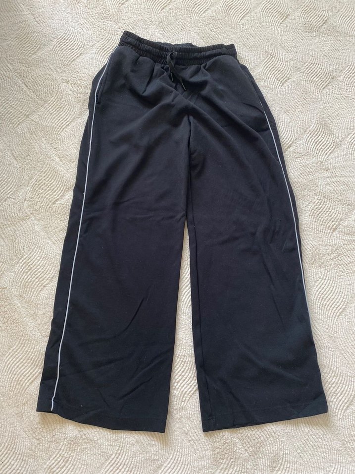 Siyah, rahat kesim ve midi boyda olan bu kumaş pantolon yan şerit detayına sahip, yumuşak sentetik kumaştan üretilmiştir.
