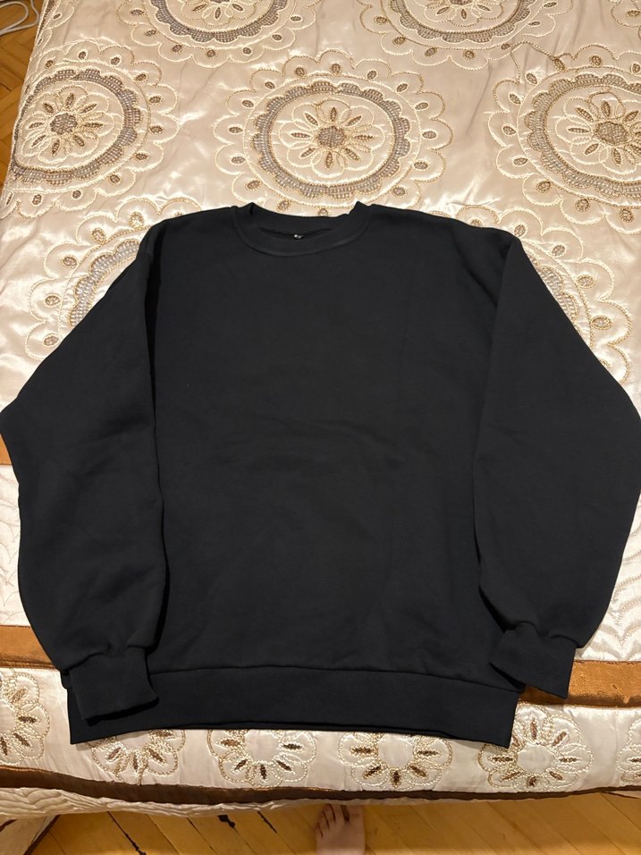 Siyah renkte, yuvarlak yaka ve uzun kollu, rahat kesim kadın sweatshirt. Yumuşak ve sıcak dokusu, sade desensiz tasarımıyla günlük kullanıma uygundur. M beden yazıyor fakat oversize xxl gibi geniş.Kalın kışlık kumaş.