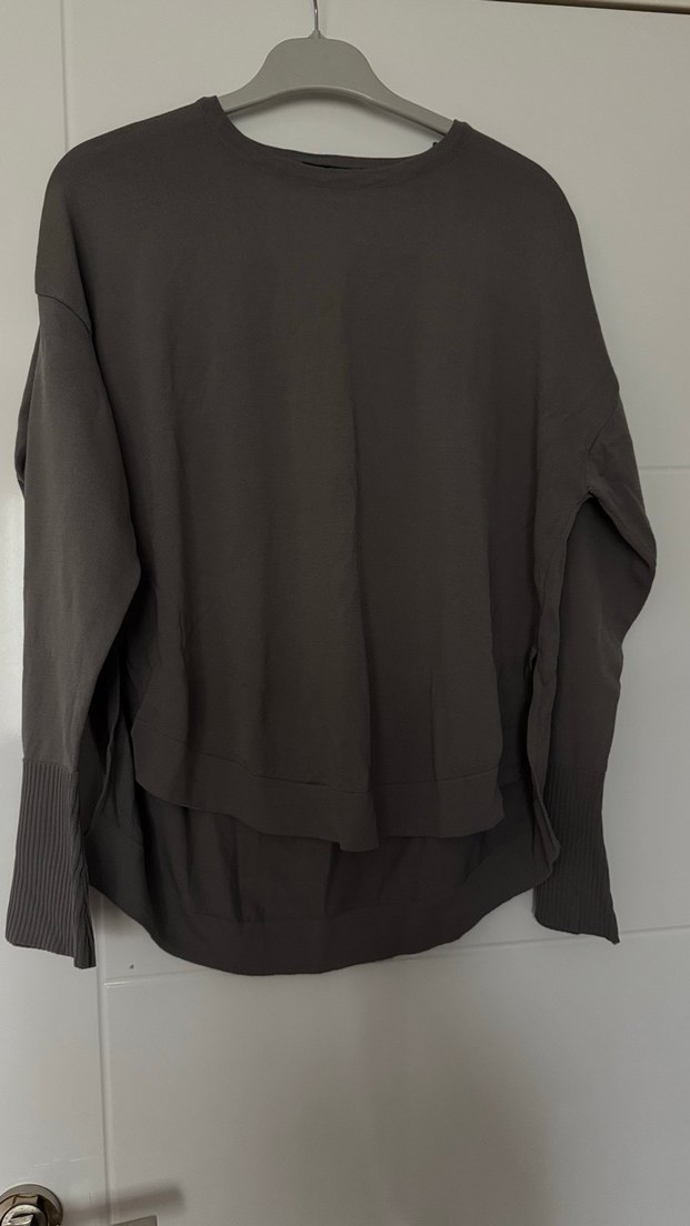 Gri renkli, uzun kollu ve yuvarlak yakalı kadın triko Rahat kesimi ve yumuşak sentetik kumaşıyla günlük kullanım için şık ve sade bir parça.