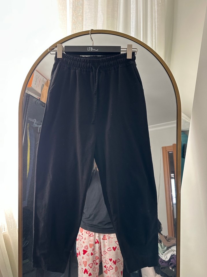 Siyah keten kumaştan, rahat kesim ve midi boy kadın pantolon, günlük kullanıma uygun sade ve şık bir görünüme sahiptir. Bel kısmı lastiklidir.
