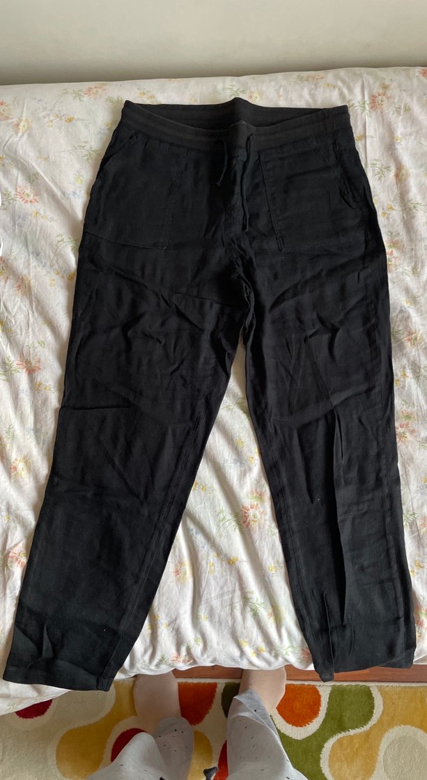 Siyah keten pantolon, rahat kesim ve midi boyda, günlük kullanıma uygun şık ve rahat bir tercih.