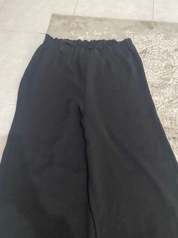 Siyah keten kumaştan, rahat kesim ve midi boyda, gündelik kullanım için sade ve konforlu pantolon. Desensiz yapısı kolay şıklık sunar. Krep kumaş bol pantolon