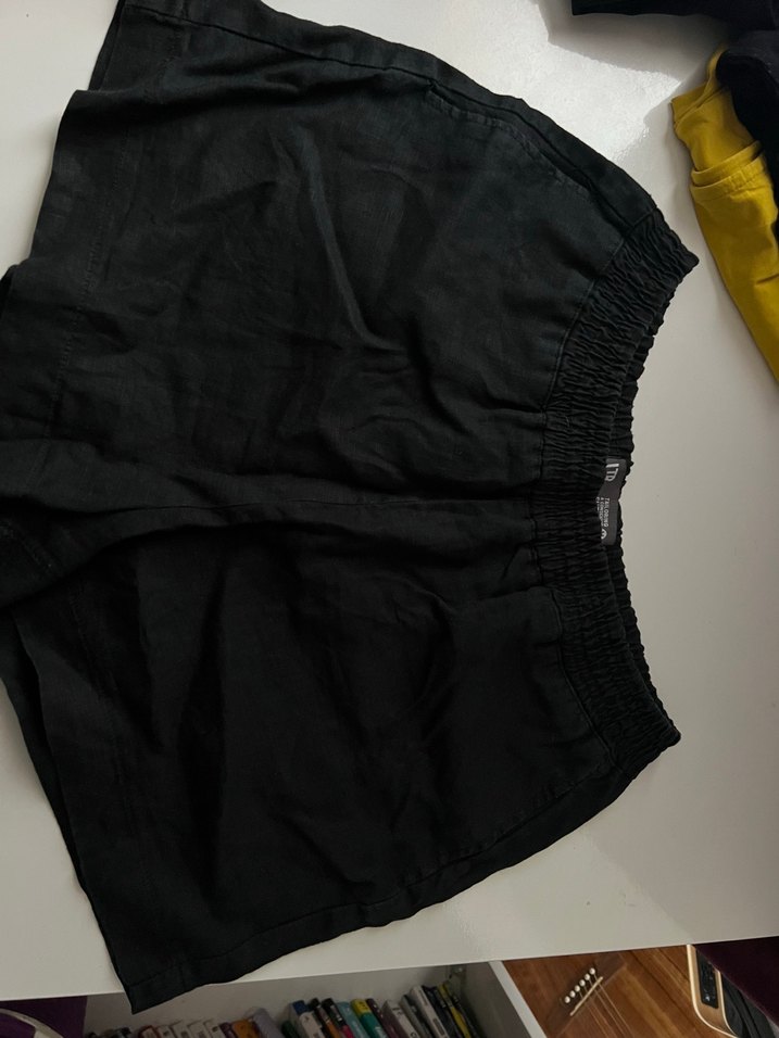 Siyah keten , rahat kesim ve midi boyda, elastik bel detaylı, günlük dış mekan kullanımı için uygun.