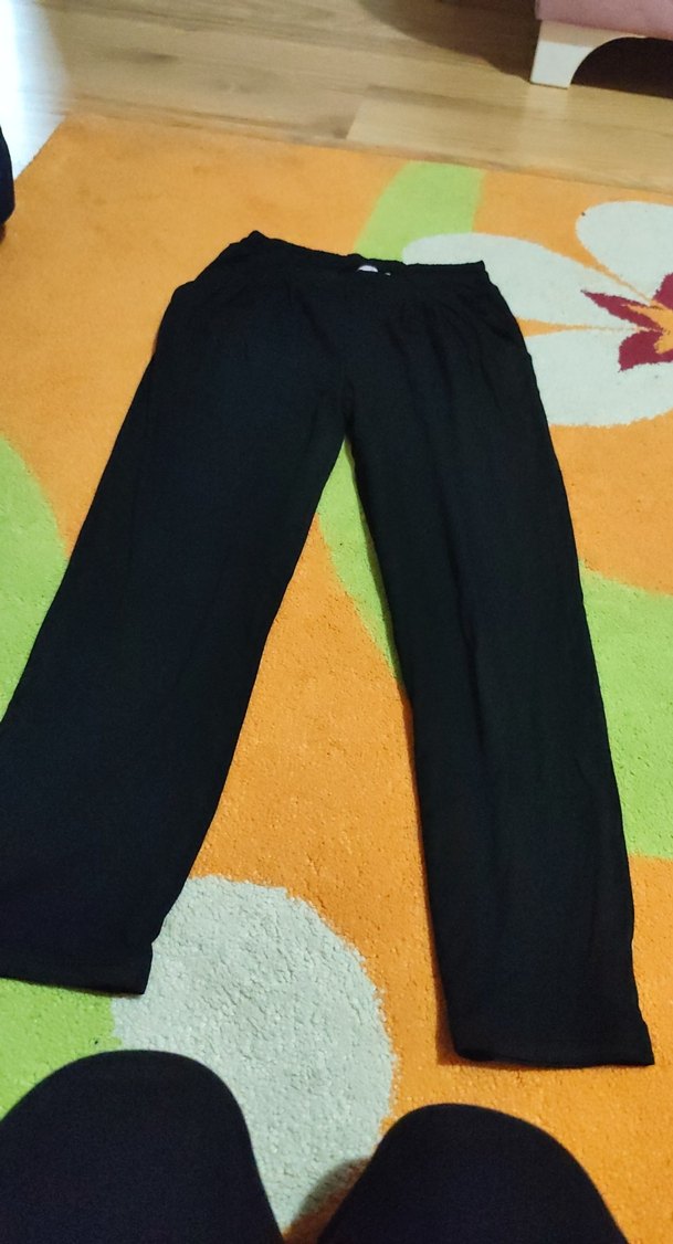 Siyah, rahat kesim, normal 8 yaş siyah kumaş pantolon. Yumuşak dokulu ve günlük kullanıma uygun.