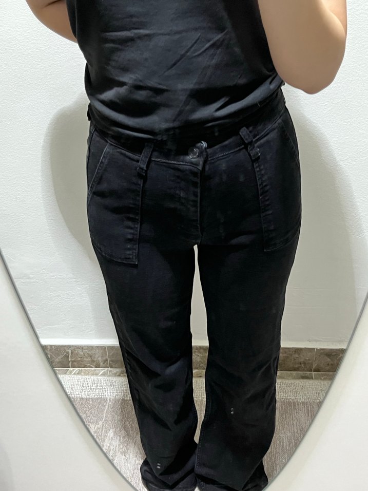 Siyah renkte, rahat,esnek kumaşlı bir pantolon,üzerinde herhangi bir sıkıntı yok ama paçaları uzun olduğu için yıprandı onun harici bir sıkıntısı yok