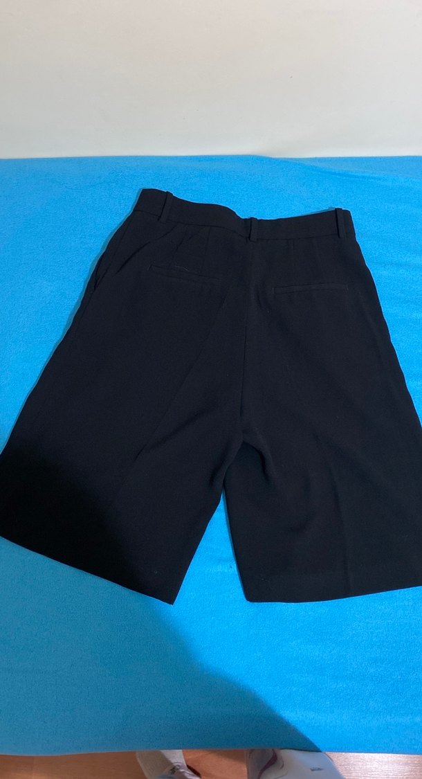 Siyah, rahat kesim midi Bermuda şort, yumuşak sentetik kumaştan, günlük sokak stiline uygun minimal tasarım.