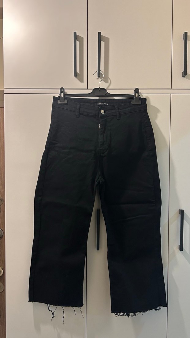 Siyah kot pantolon, rahat kesim ve midi boy ile günlük kullanıma uygun, rahat ve şık bir stil sunar. ✨