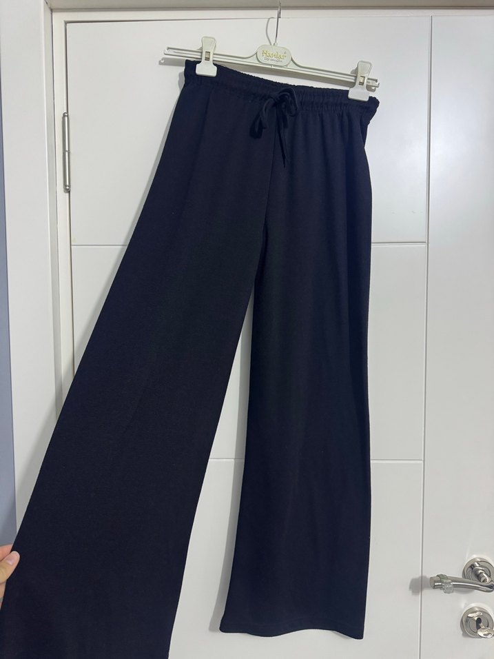 Siyah, rahat kesim midi kumaş pantolon, yumuşak sentetik kumaş ve bağcıklı lastikli bel ile konfor sağlar. Desensiz, günlük kullanıma uygun şık tasarım.