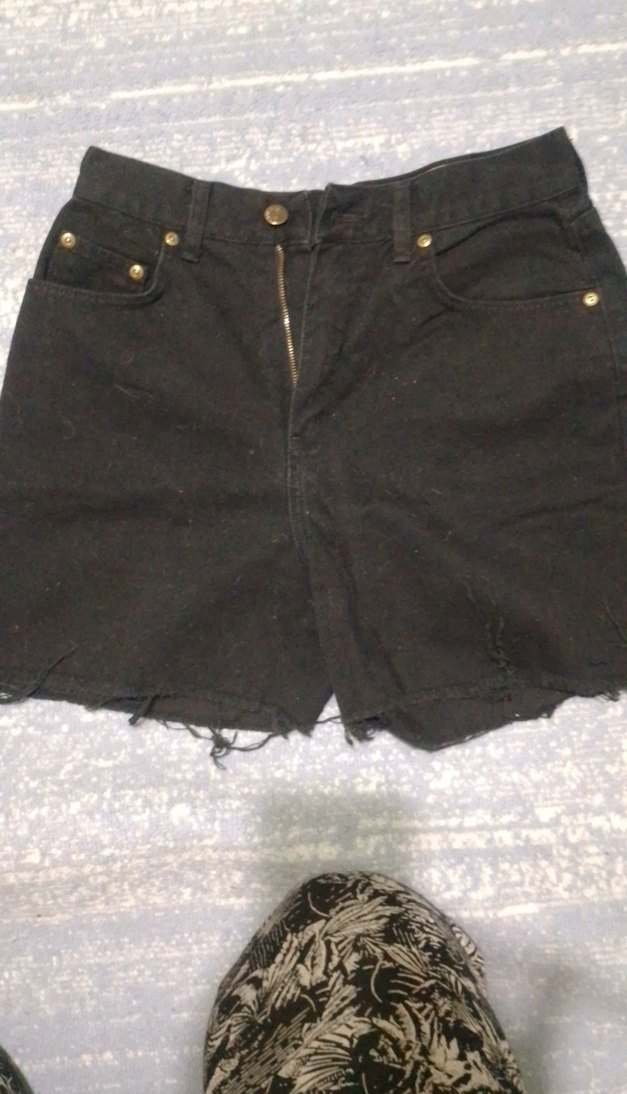 Önden fermuarlı, siyah renkli, rahat kesim mini denim şort. Alt kısmı doğal kesimli, günlük rahat sokak stili için uygun.
