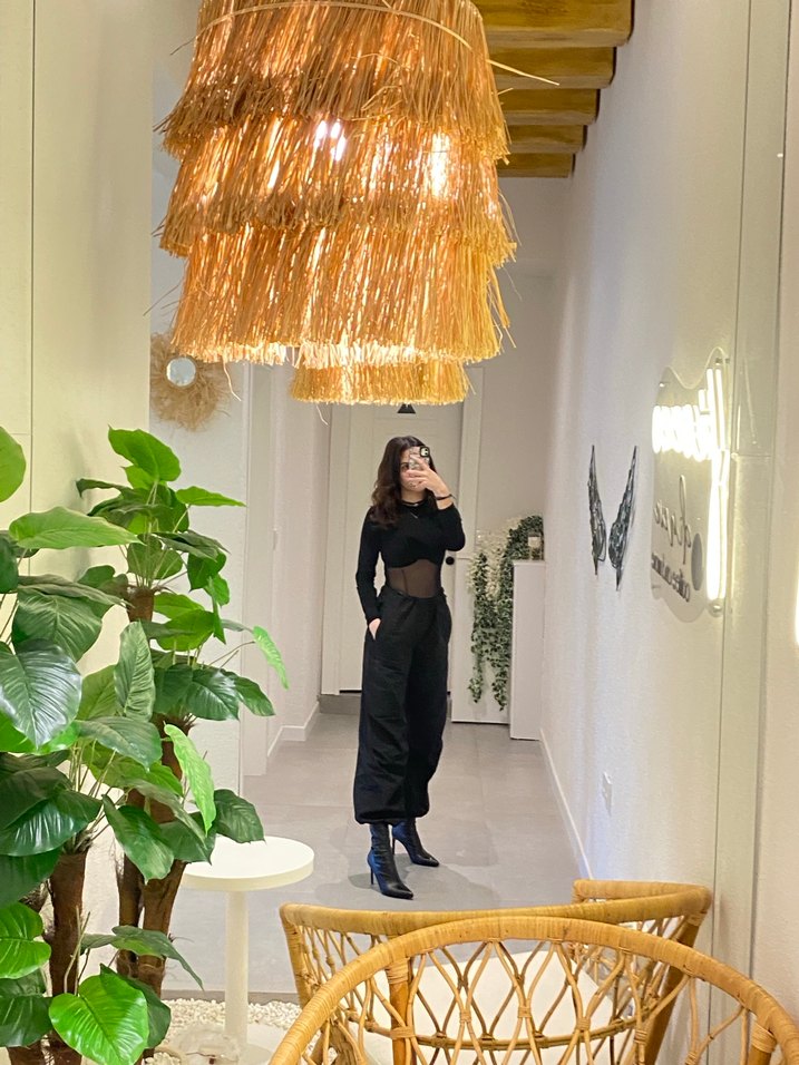 Siyah, rahat kesim midi pantolon, sentetik kumaştan üretilmiş. Sokak tarzı ve athleisure için uygun, zahmetsiz şıklık sunar.